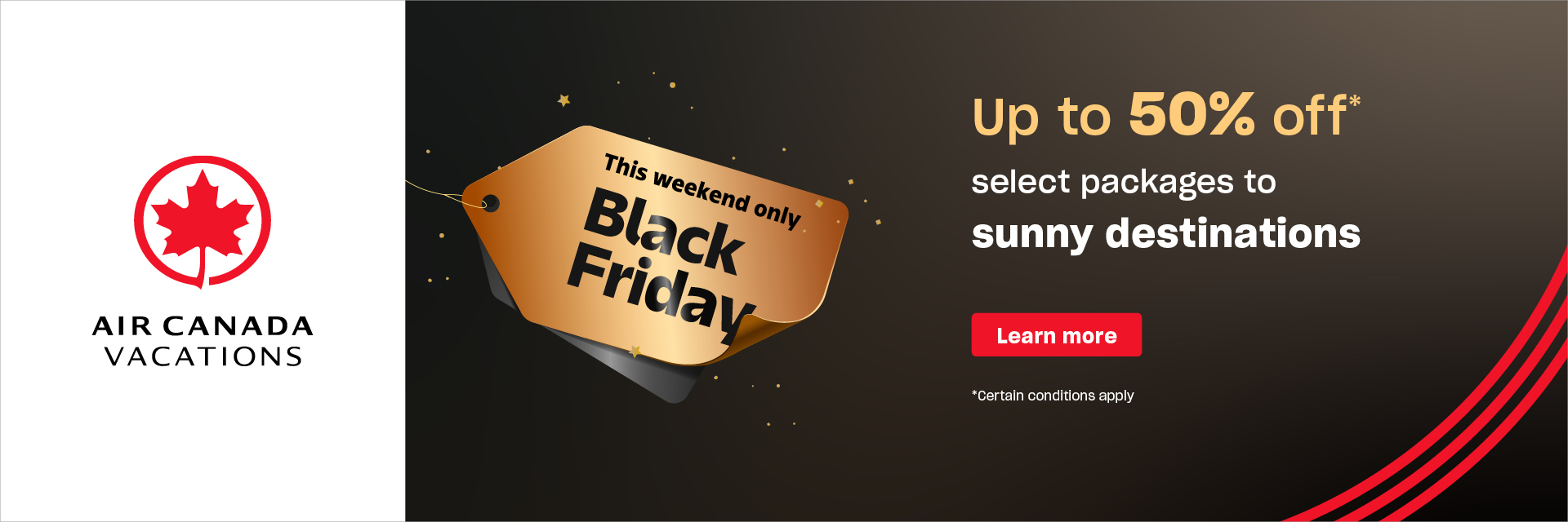 Air Canada Vacations is bringing Black Friday savings all weekend long with up to 50% off select sunny destination packages, offering you the perfect chance to book your sunny escape!